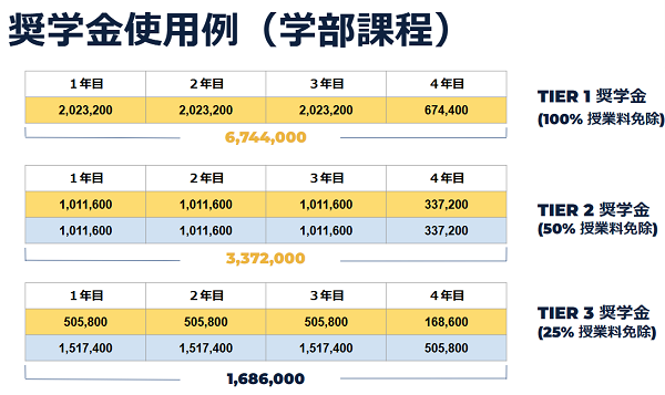 100%授業料免除(4年間の総額6,744,000円)