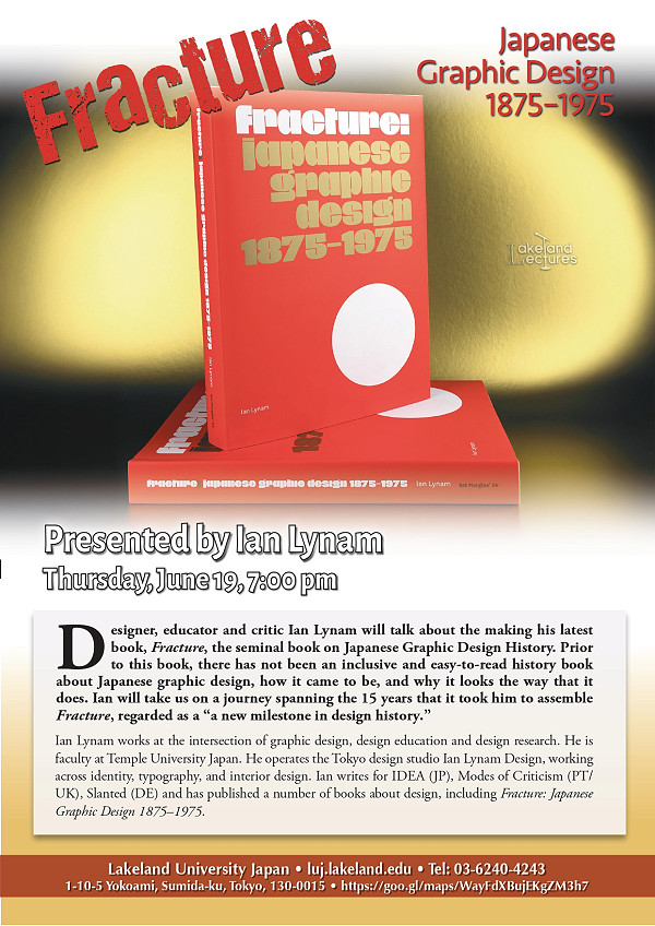 Ian is a prolific graphic designer and is on the faculty at TUJ. He gave a Lakeland Lecture 9 or 10 years ago and it was great. He is going to talk about his most recent book, “Fracture”, a history of Japanese graphic design—according to him, the first book on the topic written with general audiences in mind. This should be fascinating.