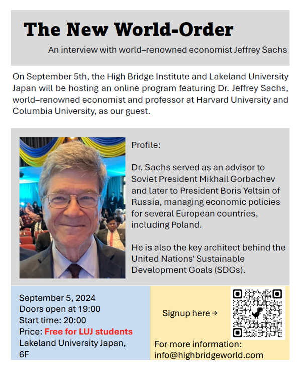 On September 5 LUJ, in conjunction with the Highbridge Institute, will hold a remote interview with Dr. Jeffrey Sachs, world–renowned economist and professor at Harvard University and Columbia University.