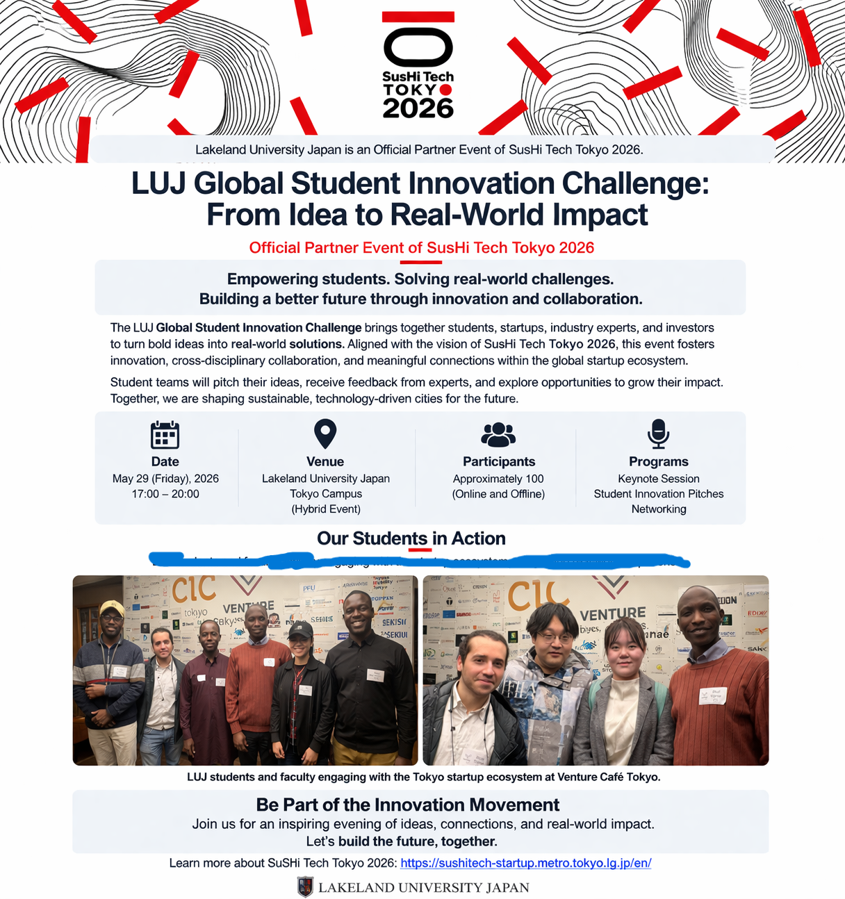 Aligned with the vision of SusHi Tech Tokyo 2026, the event fosters interdisciplinary collaboration, applied learning, and meaningful engagement with the Tokyo startup ecosystem.